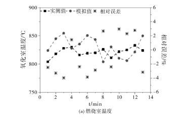 在連續(xù)監(jiān)測穩(wěn)定運行階段多個切換周期后,將燃燒室三個熱電偶及變送器監(jiān)測的爐膛溫度值計算得到平均值,同時將每個蓄熱室中的出口位置熱電偶的溫度值進行記錄,圖2為同一測點的工程實際數(shù)據(jù)與數(shù)值模擬值的對比。通過對比,得到溫度模擬數(shù)據(jù)與實際監(jiān)測值的相對誤差均在4%以內(nèi),這也可能是RTO裝置的切換閥因閥板和閥座密封性很難保證、氧化爐爐膛上部的防爆裝置存在泄漏,以及溫度監(jiān)測設(shè)備的精確度不夠等問題造成的。因此,燃燒室和蓄熱室溫度測點監(jiān)測值的平均值和模擬值相對誤差滿足數(shù)值模型準確性的要求,所以此數(shù)值模型可以較好的反應(yīng)RTO裝置在正常運行階段的溫度變化情況。